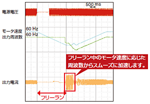 速度搜索方式:自由運行狀態(tài)的電機即使沒有速度傳感器,也可以輕松啟動(示例:風(fēng)扇、鼓風(fēng)機等裝有旋轉(zhuǎn)體的流體機械)