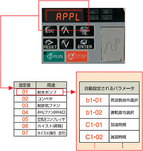 能按用途設(shè)定最佳參數(shù)的變頻器:僅需選擇共水泵、傳送帶、供氣排氣風(fēng)扇等的用途,即可自動設(shè)定最適合的參數(shù)�?s短了運行時間。